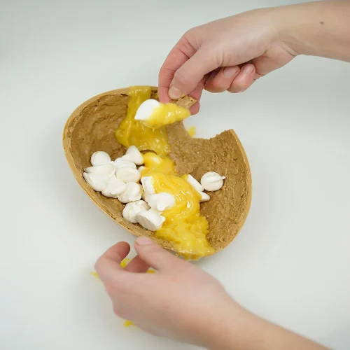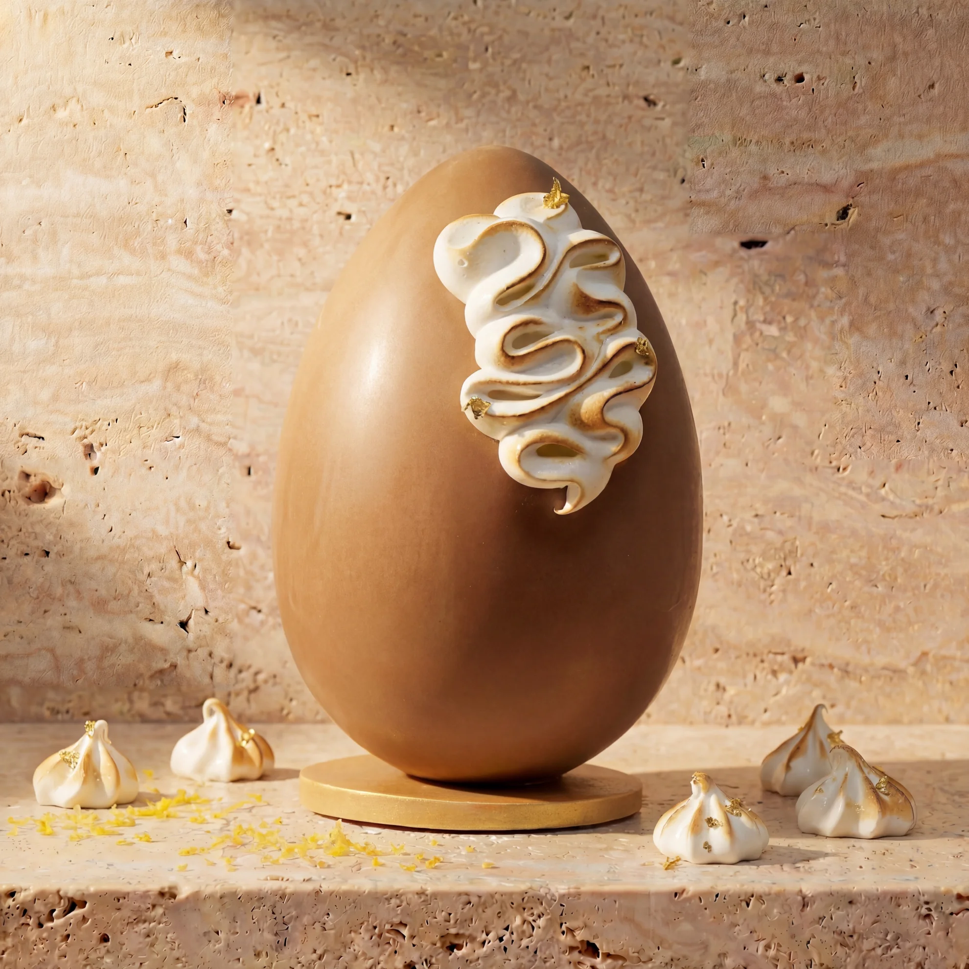Cioccolato biscottato, frolla, meringhe e crema al limone. Un uovo fresco e agrumato.