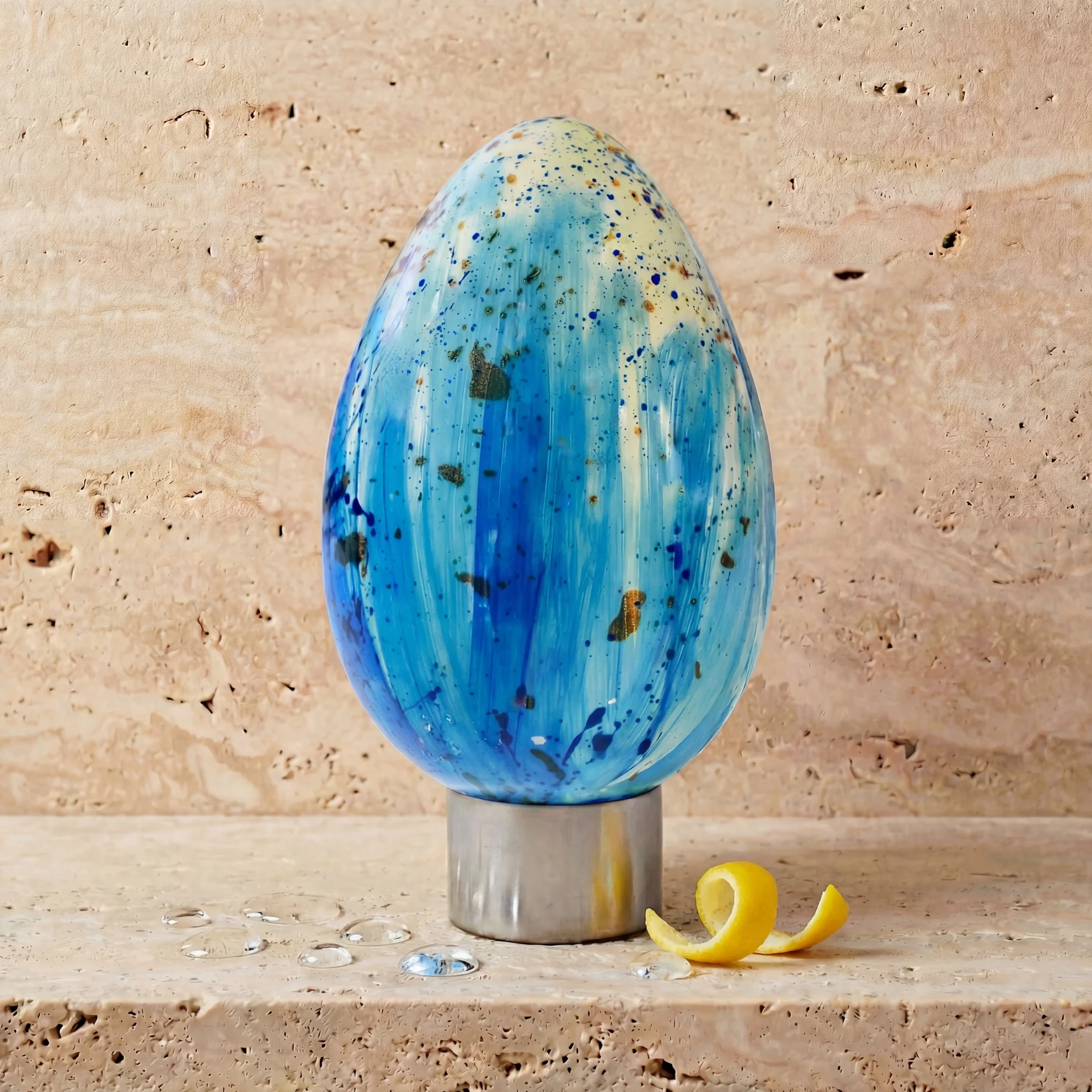 Cioccolato bianco e ganache al gin tonic con fave di cacao candite. Un uovo fresco e sorprendente.